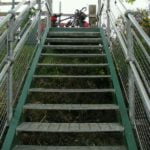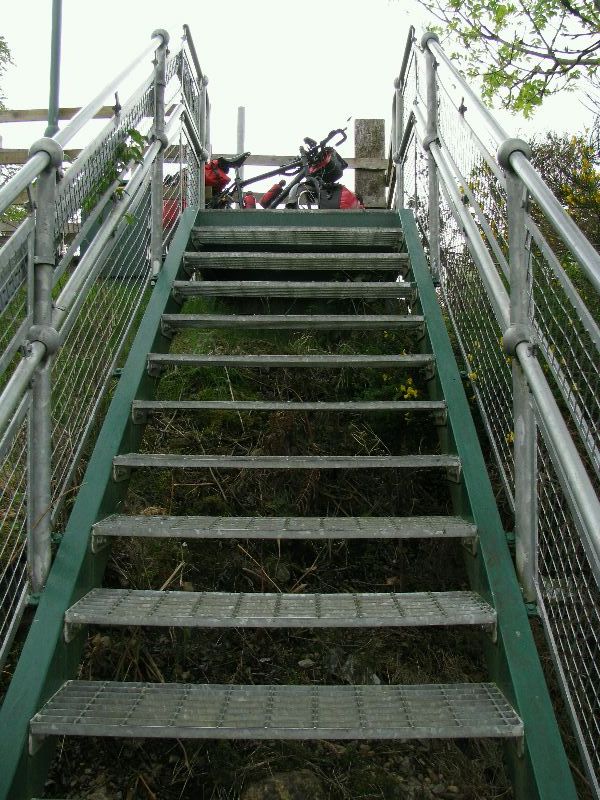 De route ging verder over erg mooie wegen, langs watervallen en rivieren. En over een spoorbrug waar een metalen wandelpad met een metalen steile trap naast lag. Dat was dus weer een keer alle bagage van de fiets halen, de fiets naar de overkant brengen, teruglopen en de bagage ophalen. Je zou eraan gaan wennen.