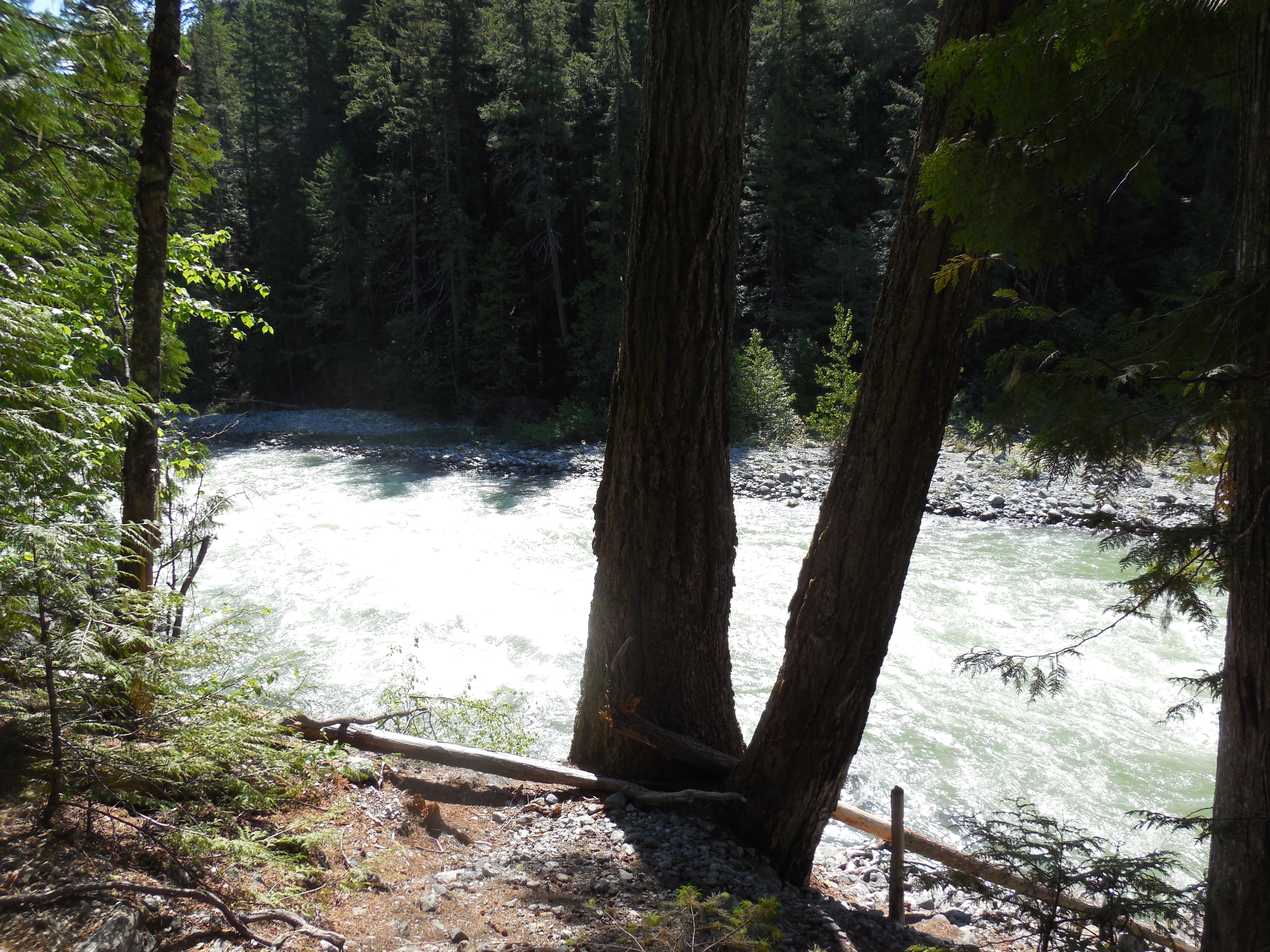 Op de camping aangekomen heb ik een mooi plekje uitgezocht waar zowel mijn tent als de gigantische camper van Frans en Anja zou passen. Er was net geen uitzicht op de rivier, die plekken waren ofwel al gereserveerd, ofwel te klein. Maar, aan de rand van de camping, bijna midden in het bos was ook geen verkeerde plek. Via een paadje, net naast ons plekje, konden we toch nog bij de rivier komen. In dat snel stromende ijskoude water heb ik zo goed en zo slecht als het ging mijn kleding maar eens uitgespoeld.
