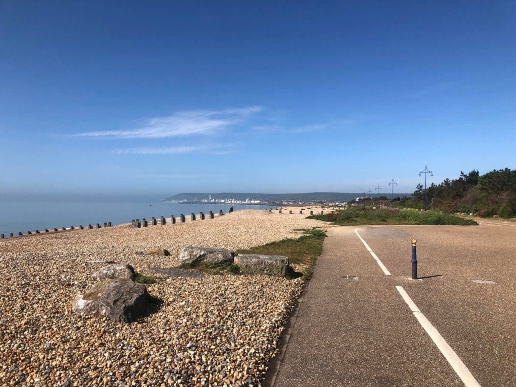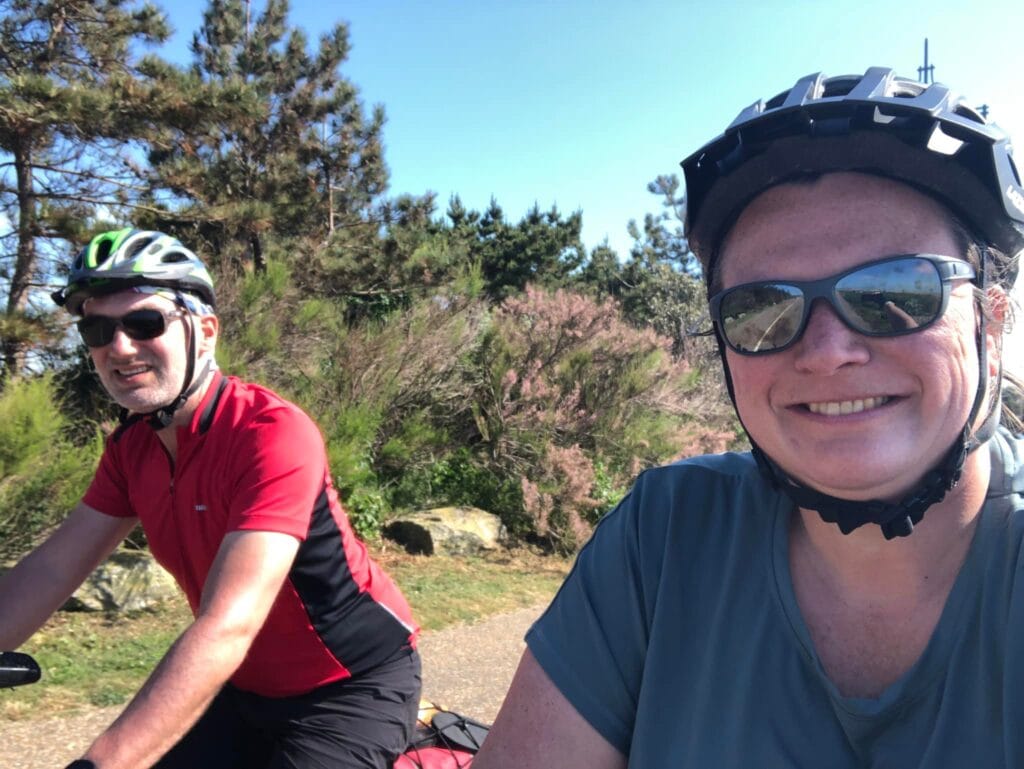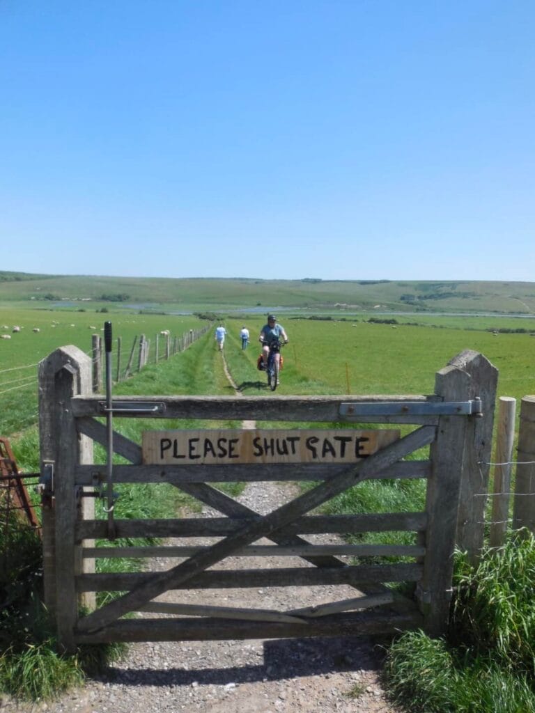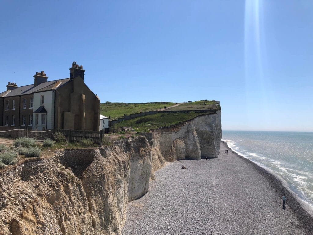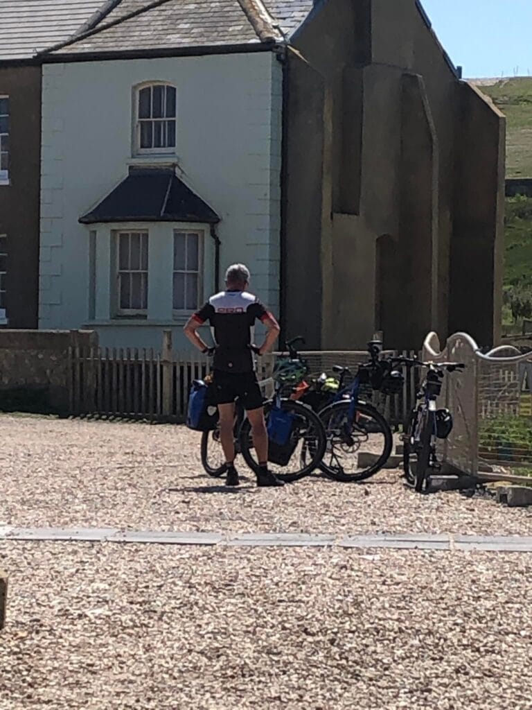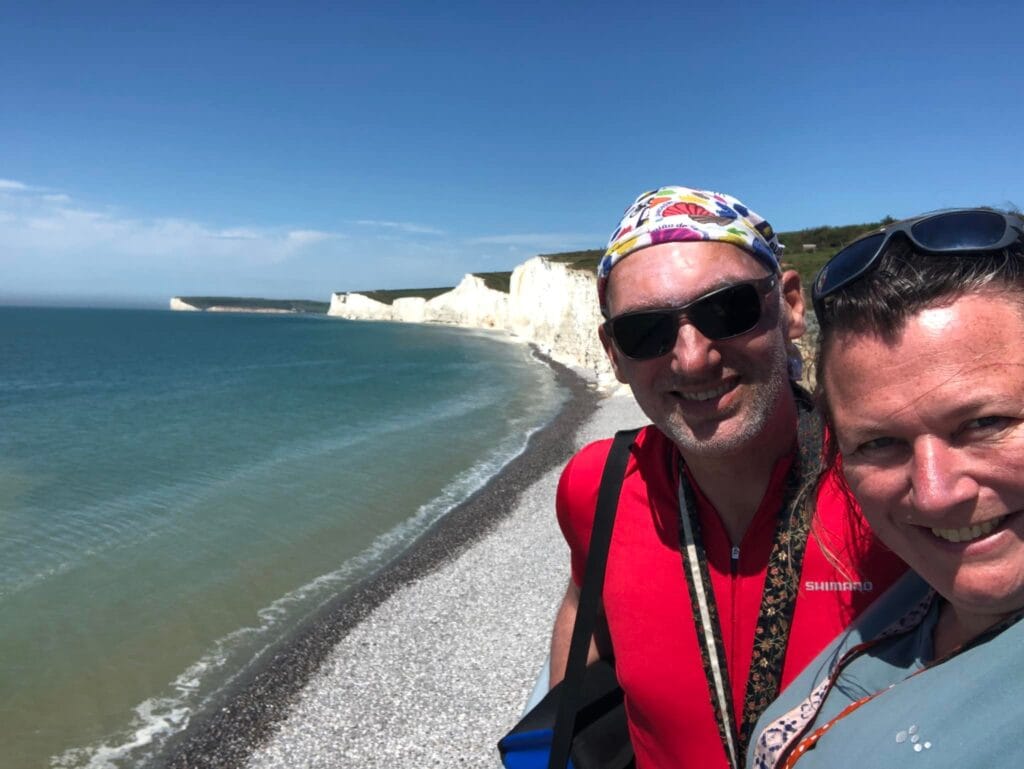 Daarna weer verder omhoog, maar nu weer fietsbaar. Marc stond me op de top aan te moedigen. We waren aangekomen bij Beachy head. Vanaf daar gingen we met 70km/u naar beneden. Bij een uitzichtpunt dronken we koffie en genoten van het uitzicht. Terwijl ik ons plekje bezet hield zag ik van een afstandje een andere fietser onze fietsen een nadere inspectie te geven. Heel grappig om te zien.