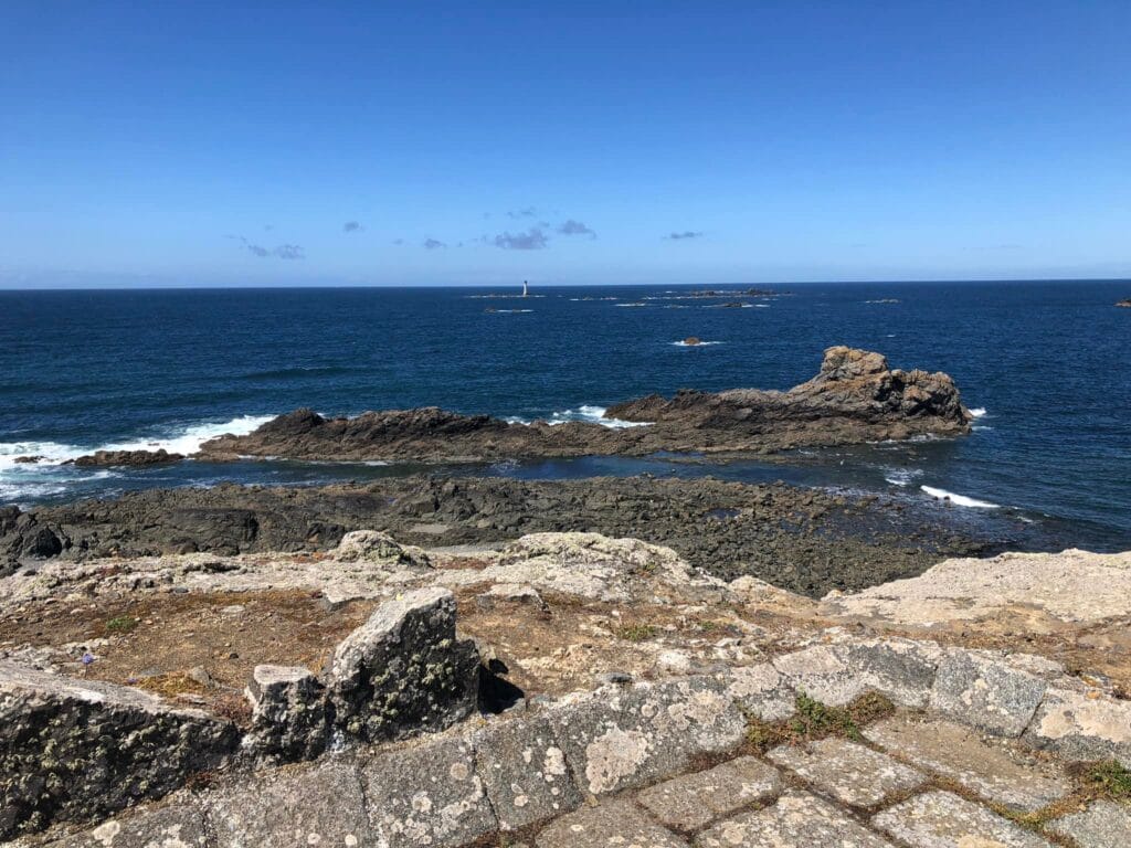 We gaan Guernsey verkennen vandaag. Pas tegen 10 uur zitten we op de fiets. Er staat een straf windje wat het fris maakt. Maar de zon schijnt heerlijk en dat is meteen verraderlijk: in de luwte is het warm en zonder bescherming verbrand ik meteen.