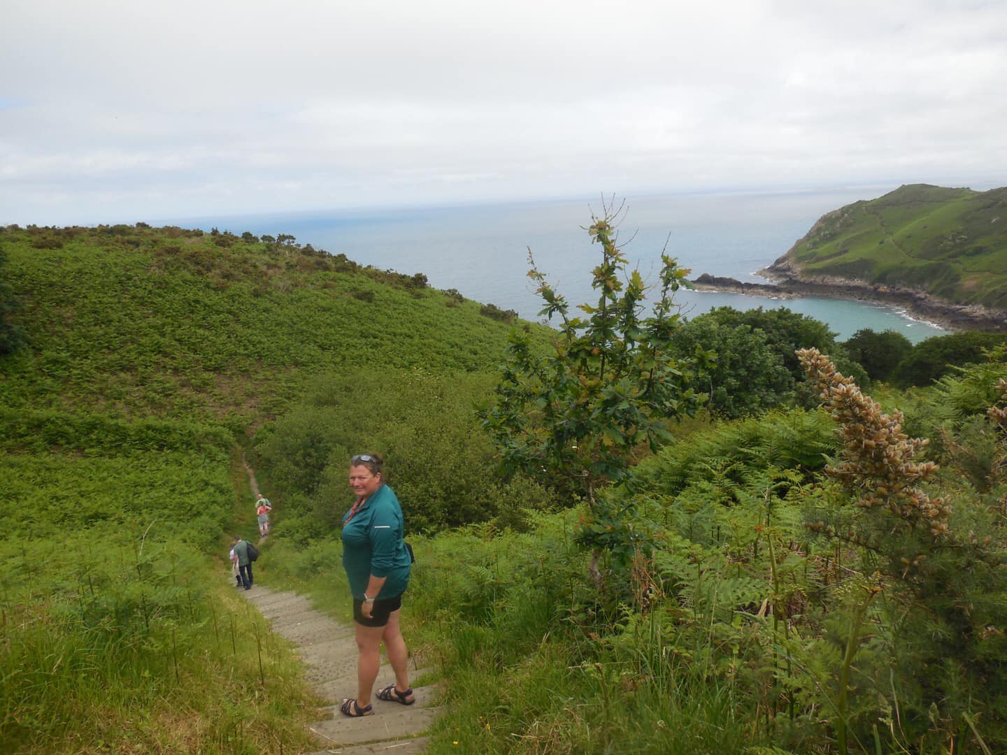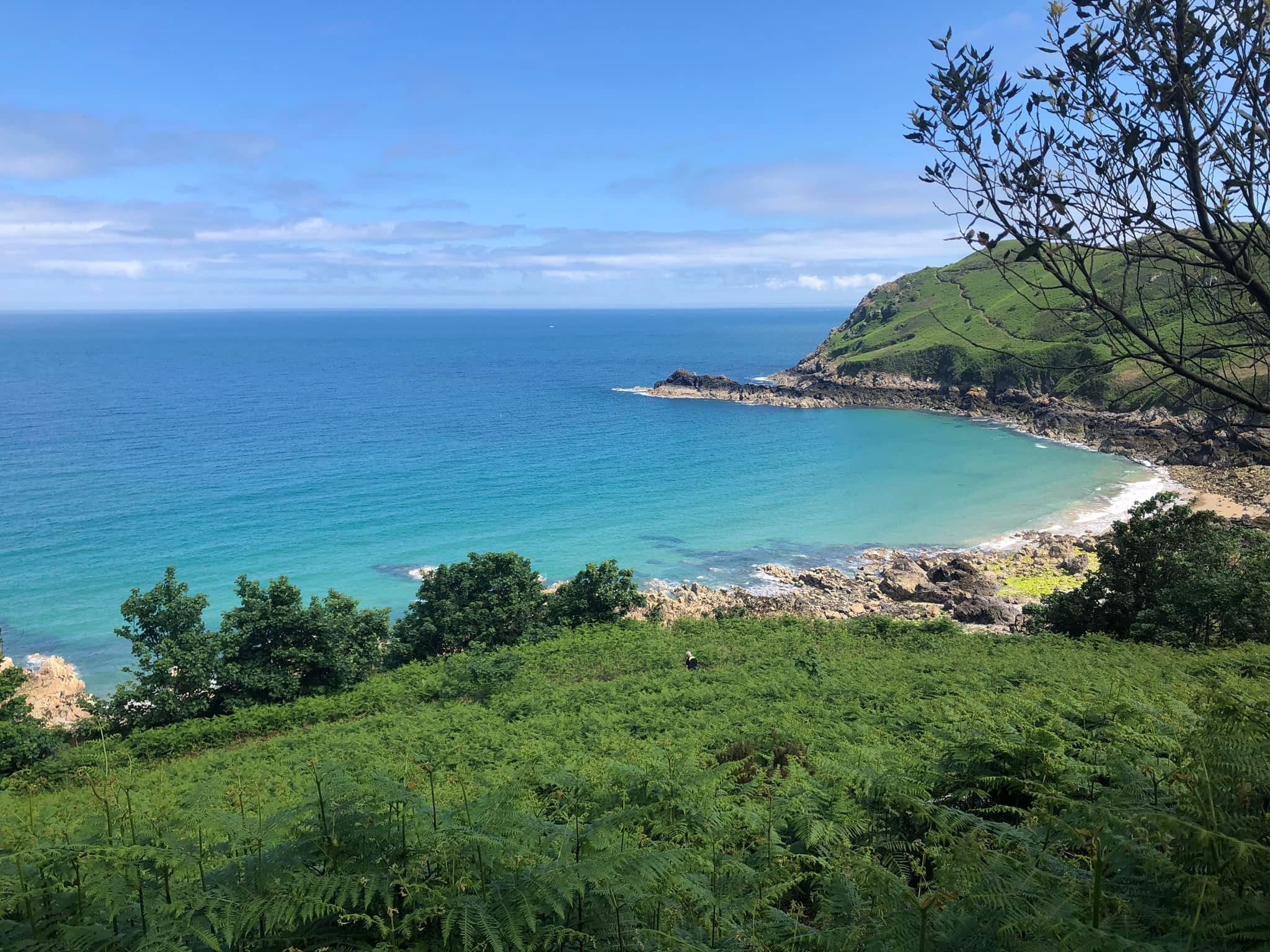Al voor de middag zitten we op de fiets. De tent en bagage laten we op de camping staan. Ons eerste doel is de oudste cache van Jersey vinden. Bij de parkeerplaats zetten we de fietsen neer en dalen af over een trap naar het wandelpad langs de baai. De cache ligt niet aan een pad. Marc loopt door tot het wandelpad en ik probeer een soort van pad door de varens. Uiteindelijk lukt het mij om door de varens bij de cache te komen. Deze ligt er al 20 jaar! Het logboek gaat 11 jaar terug. Heel grappig om wat verhaaltjes te lezen die mensen er in hebben gezet. En een waanzinnig mooie locatie: uitzicht over een baai met ruige rotsen en hellingen vol met varens. Blauwe lucht en azuurblauwe zee. Fantastisch!