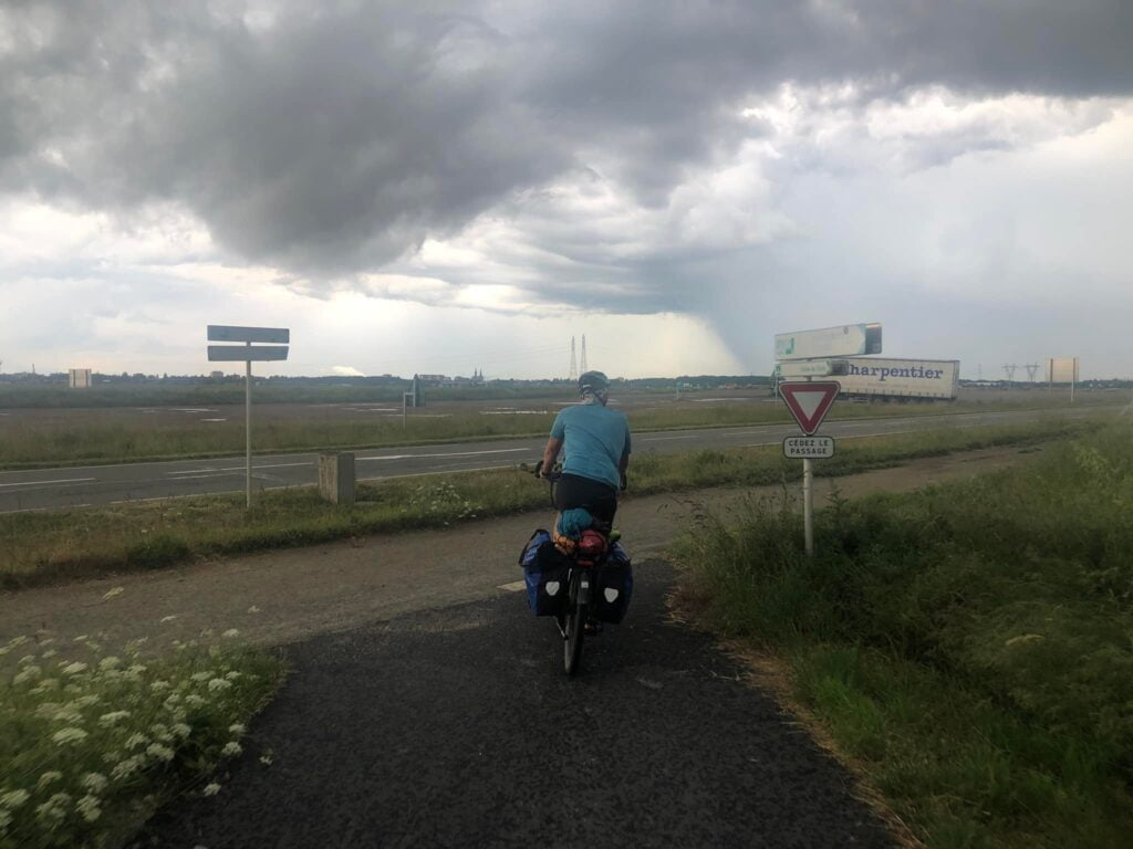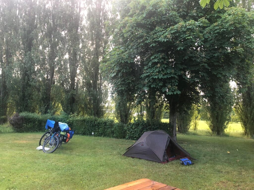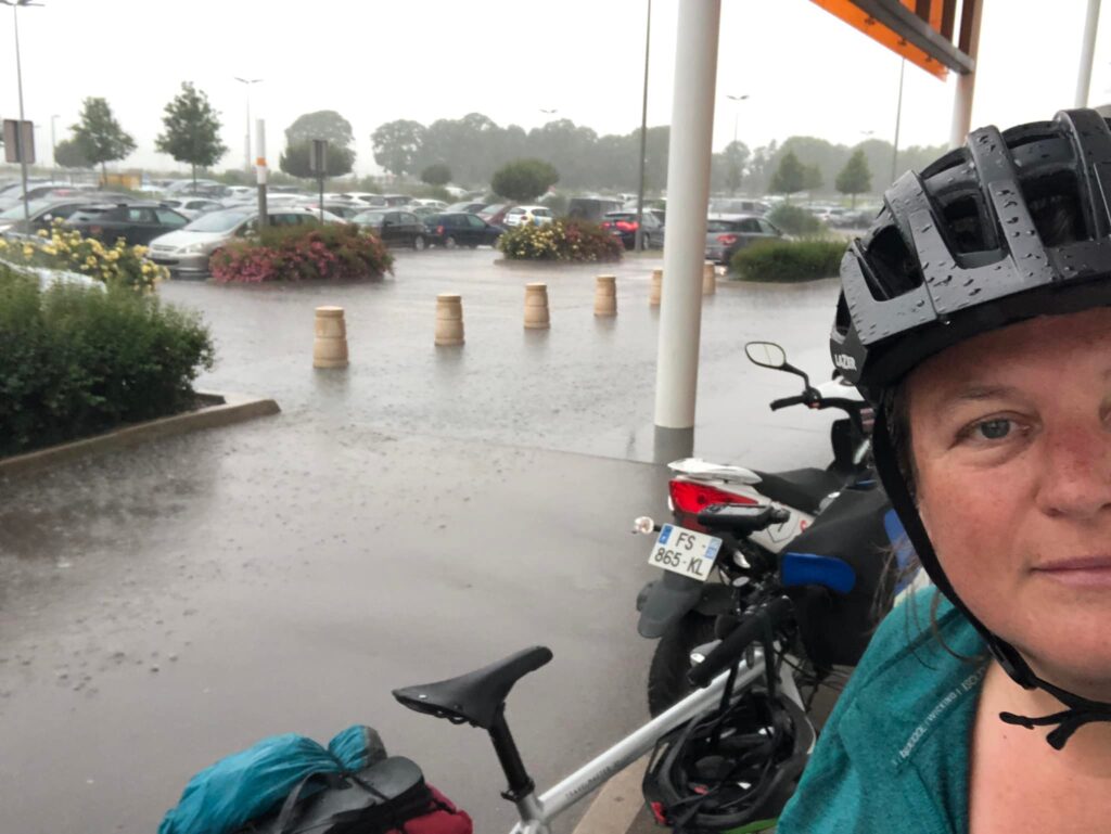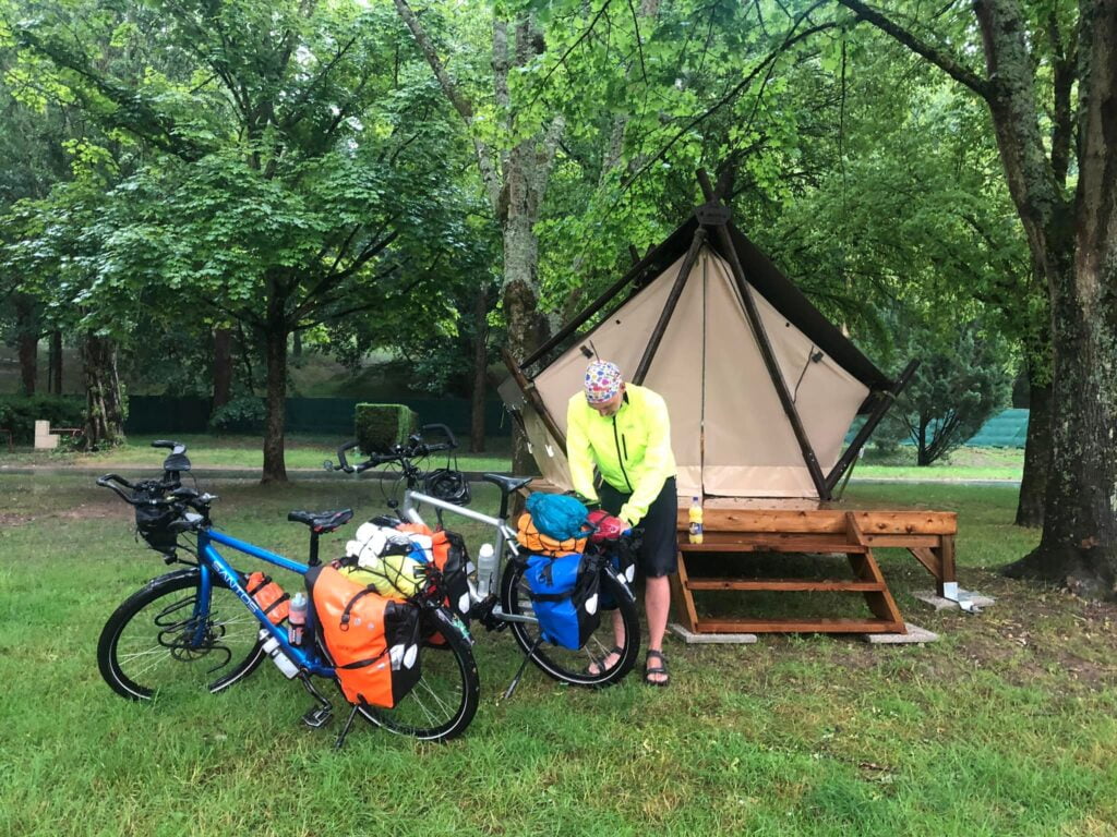 Vlak voor Chartres, kreeg Marc het idee op bij E. Leclerc nog even boodschappen te doen. Nu we hier toch zijn… Het was wel een mega supermarkt, maar we waren moe dus bij de camping nog iets verzinnen, dat ging er niet van komen. Als Marc net binnen is, barst er een wolkbreuk los en komt het water met bakken naar beneden. Uiteindelijk moeten we nog ruim een half uur fietsen naar de camping. We zijn doorweekt als we daar aan komen, na 77 km fietsen. In de receptie staan we letterlijk uit te druppen, de medewerkers nemen ruim de tijd om iedereen in te schrijven. Ik grap naar Marc dat zo’n glampingtent wel heel handig zou zijn nu. Dan hoeven we geen tent op te zetten. Hij had er al naar gekeken, maar op de site was er niks vrij. Toch bleek er eentje beschikbaar. Ja die nemen we! Het is onze geluksdag!