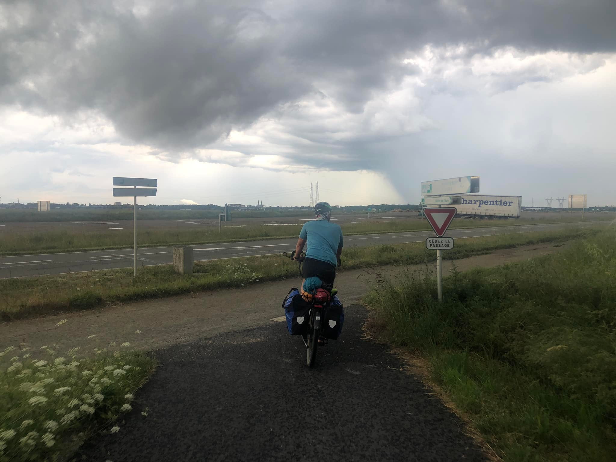 Vannacht heeft het vanaf 00.30 uur eigenlijk onophoudelijk gehoosd en geonweerd. Als we opstaan is het droog. Ik heb prima geslapen, maar onze uitgewassen spullen en handdoeken waren wel nat. Dan snel maar op de fiets.