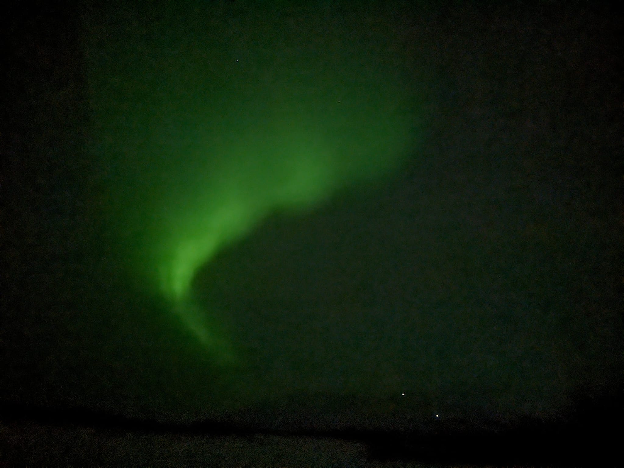 Na het heerlijke eten worden we er door de ober op geattendeerd dat het noorderlicht zichtbaar is. In ene valt het me op dat alle gasten zijn verdwenen. We kleden ons aan en lopen naar de helilandingsplaats, vlak naast het hotel. Het ziet er heel anders uit dan op foto’s, maar het blijft een bijzonder fenomeen. We zien er, ondanks de lichtvervuiling van het dorp, veel meer van dan gisteren op de berg. De foto’s lukken niet echt dus blijven we vooral veel kijken.