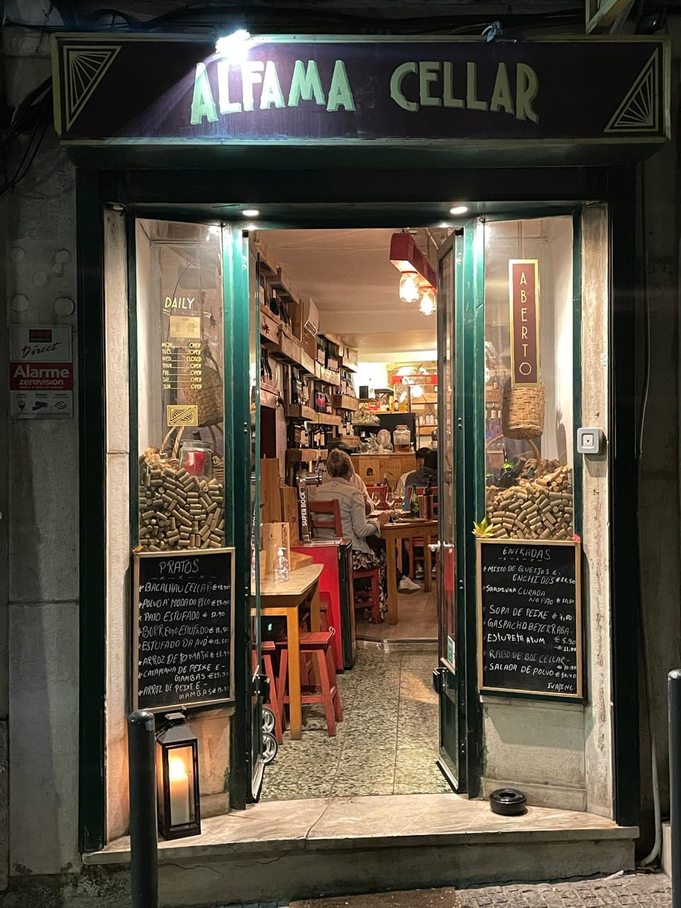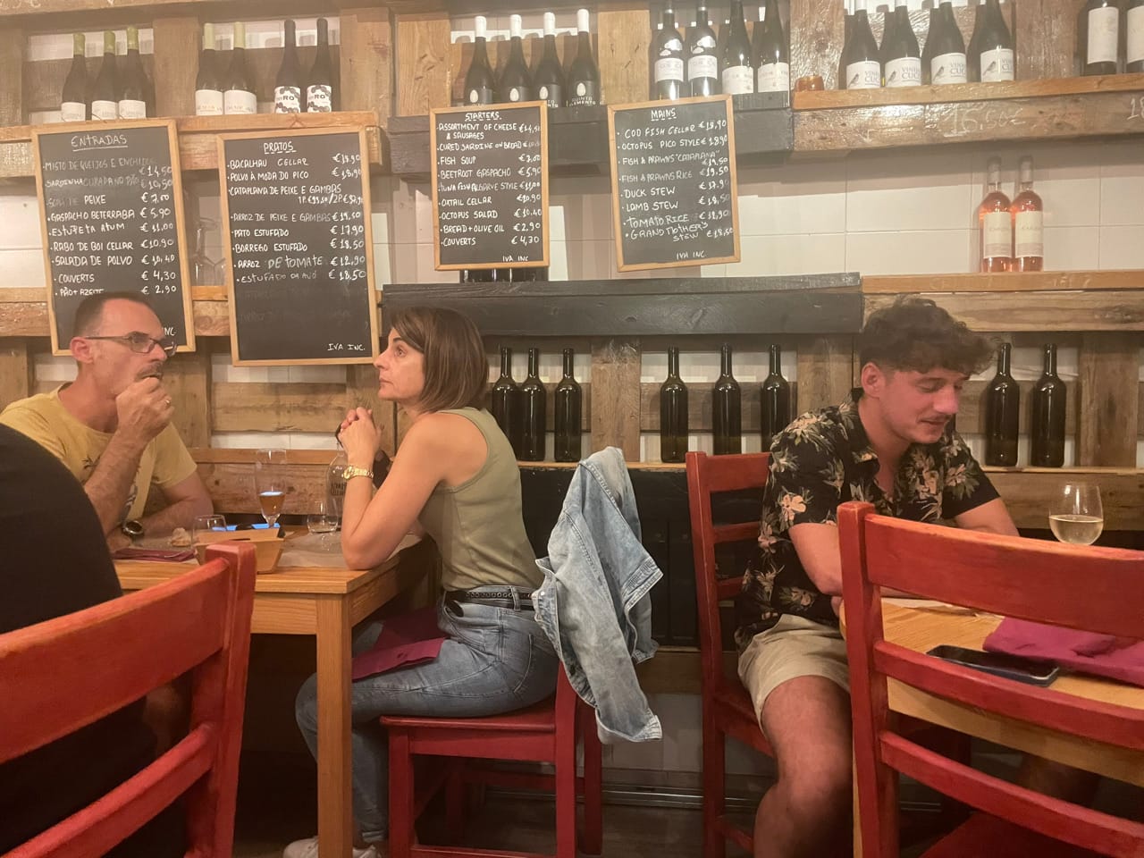 We lopen langs de kade, geleid door de koelte van de bries, de nieuwsgierigheid en wat geocaches. We lopen heuvel op richting de oude wijk Alfama. Oude, smalle straatjes met kleine winkels en restaurantjes. De ene leeg, de andere helemaal vol. Bij eentje lopen we naar binnen om te vragen of er een plekje vrij is. Nu niet, maar over 10 minuten wel, krijgen we als antwoord. Na 5 minuten nemen we plaats aan een tafeltje van 80x80cm. Het restaurant zit in een soort kelderachtige ruimte, maar op straatniveau. Het is er smal. Ik tel 18,5 planken laminaat, dus 3,70m op z’n breedst. We kunnen uit 8 hoofdgerechten kiezen, 4x vis en 4x vlees. Het is er heerlijk en als de luidruchtige beschonken Amerikanen vertrekken, ook heel rustig.