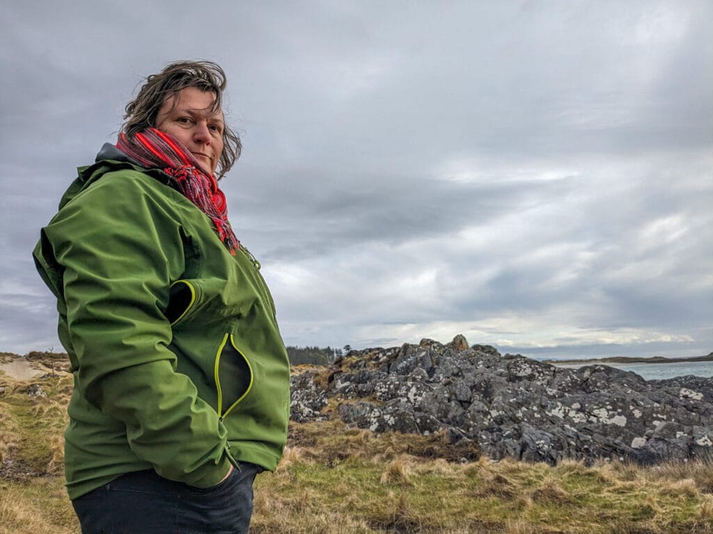 Het is eindelijk even droog dus we strekken onze benen en lopen naar een geocache in de buurt. Deze ligt op een rustig strandje met mooi uitzicht op Skye.