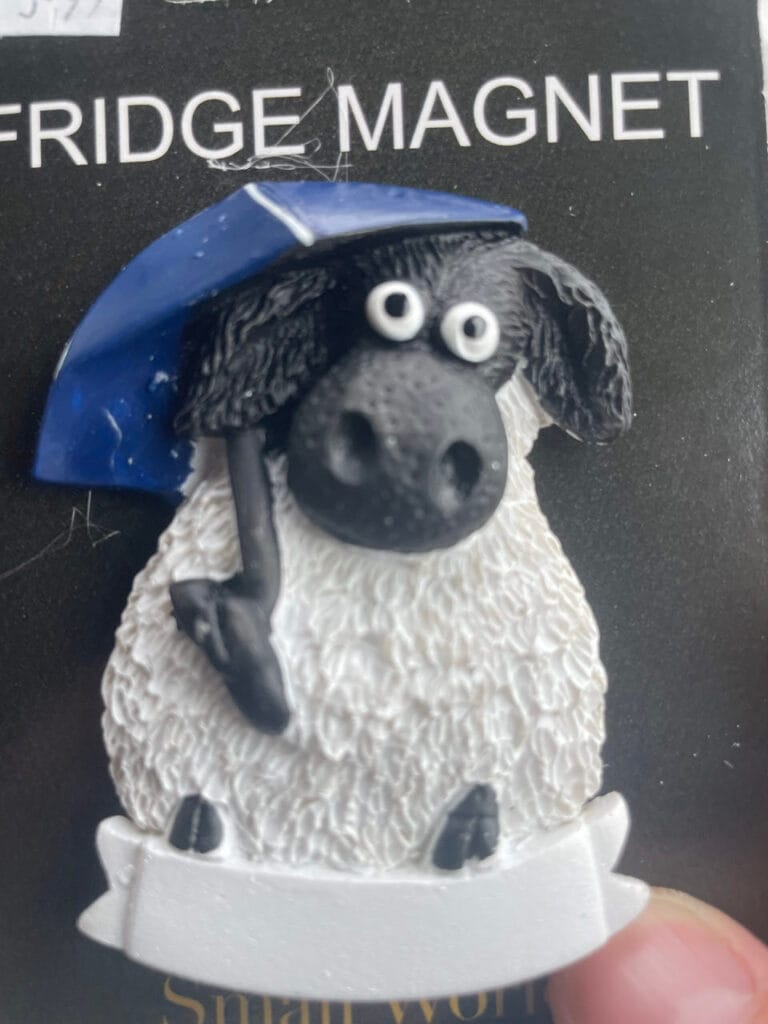 In Fort Augustus nemen we een kijkje bij de sluizen. Ik vind dat altijd een heerlijke plaats om naar de bedrijvigheid te kijken. Mega toeristisch ook, want aan het kanaal staat een doedelzakspeler de boel op te leuken (of niet, het is maar hoe je het bekijkt). Veel toeristen betekent ook veel keuze aan lelijke magneetjes. We stappen een kerkje binnen wat nu een souvenirwinkel is, en kopen een magneetje wat de vakantie zo ongeveer samenvat: een schaap (met zwarte kop en witte vacht) met een paraplu. Eigenlijk missen we alleen nog de gele stippen van de bloemen van de gaspeldoorns, maar dat is voor een volgende keer.