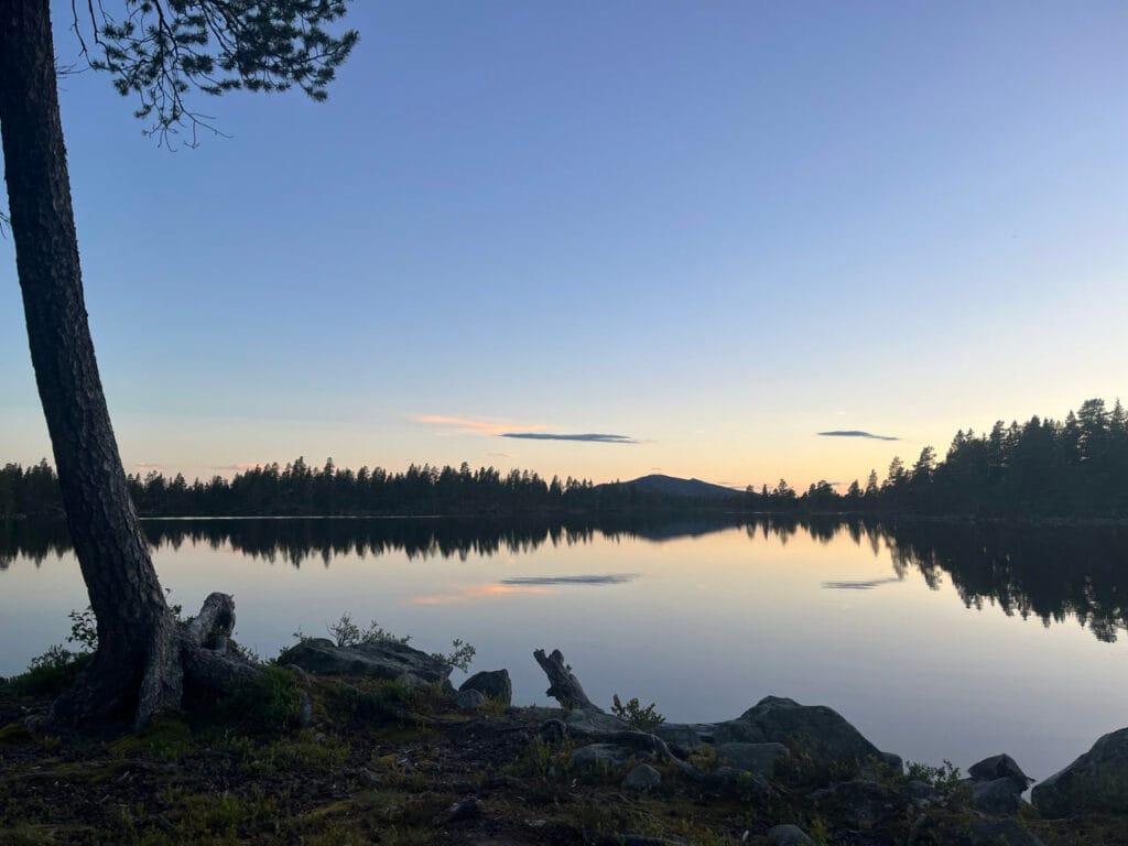 Ik kan de slaap niet vatten. Om 23 uur slaap ik nog niet. De zon gaat zo onder. Ik vraag Marc of hij zin heeft in een nachtelijk vaartochtje. Dat wil hij wel! We kleden ons aan en pompen de boot op. Vanwege de warmte vanmiddag hebben we die half leeg laten lopen. We varen een inham in van Uthussjön. De bomen, de stenen en het water hebben nu een andere kleur, een andere beleving. Het is windstil op het water. Als we stil houden, horen we echt niks, zelfs geen vogels. Heel gaaf! Na 1,5 uur houden we het voor gezien en keren we terug naar ons bivak.