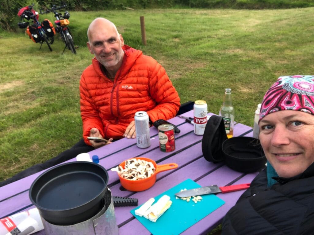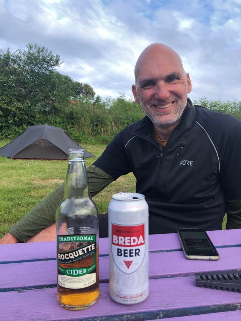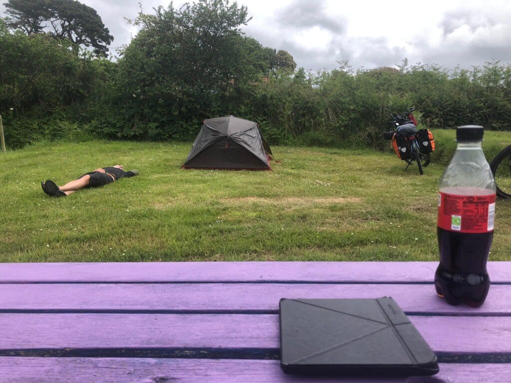 Marc is moe van een paar nachten slecht slapen dus die stuur ik uit op een dutje in het gras. Ik zet de natte tent op, zet alles open zodat deze goed kan drogen. Na een kwartier kunnen ook de matjes en de kussens er in.
